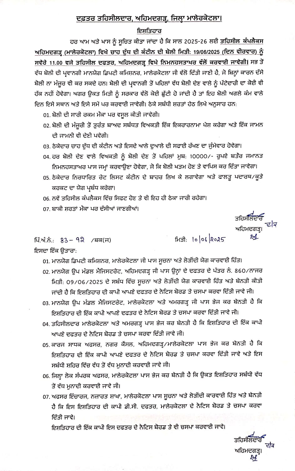 ਤਹਿਸੀਲਦਾਰ ਕਮਲਜੀਤ ਸਿੰਘ ਨੇ ਜਾਣਕਾਰੀ ਦਿੰਦਿਆਂ ਦੱਸਿਆ ਕਿ ਸਾਲ 2025-26 ਲਈ ਤਹਿਸੀਲ ਕੰਪਲੈਕਸ , ਅਹਿਮਦਗੜ੍ਹ, ਜ਼ਿਲ੍ਹਾ ਮਾਲੇਰਕੋਟਲਾ ਦੇ ਚਾਹ-ਦੁੱਧ ਦੀ ਕੰਟੀਨ ਦੀ ਬੋਲੀ 19 ਜੂਨ 2025 ਦਿਨ ਵੀਰਵਾਰ ਨੂੰ ਸਵੇਰੇ 11.00 ਵਜੇ ਤਹਿਸੀਲ ਦਫ਼ਤਰ ਅਹਿਮਦਗੜ੍ਹ ਵਿਖੇ ਉਹਨਾਂ ਵੱਲੋਂ ਕਰਵਾਈ ਜਾਵੇਗੀ। ਜੇਕਰ ਉਕਤ ਮਿਤੀ ਨੂੰ ਸਰਕਾਰ ਵੱਲੋਂ ਛੁੱਟੀ ਹੋ ਜਾਂਦੀ ਹੈ ਤਾਂ ਇਹ ਬੋਲੀ ਅਗਲੇ ਕੰਮ ਵਾਲੇ ਦਿਨ ਇਸ ਸਥਾਨ ਤੇ ਅਤੇ ਇਸੇ ਸਮੇਂ ਉੱਤੇ ਕਰਵਾਈ ਜਾਵੇਗੀ। ਉਨ੍ਹਾਂ ਕਿਹਾ ਕਿ ਚਾਹਵਾਨ ਵਿਅਕਤੀ ਆਪਣੀ ਸਕਿਉਰਿਟੀ ਰਕਮ ਮੁਬਲਿਗ 10 ਹਜ਼ਾਰ ਰੁਪਏ ਬਤੌਰ ਜ਼ਮਾਨਤ ਤਹਿਸੀਲਦਾਰ, ਅਹਿਮਦਗੜ੍ਹ ਪਾਸ ਜਮਾਂ ਕਰਵਾ ਕੇ ਬੋਲੀ ਦੇ ਸਕਦਾ ਹੈ । ਹੋਰ ਸ਼ਰਤਾਂ ਮੌਕੇ ਤੇ ਦੱਸੀਆਂ ਜਾਣਗੀਆਂ ।