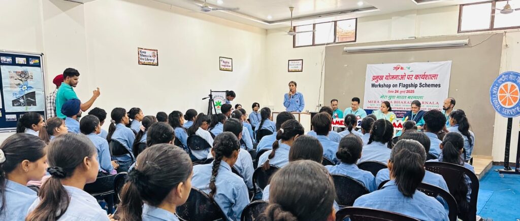 ਹੰਡਿਆਇਆ/ਹਿਮਾਂਸ਼ੂ ਗੋਇਲ: ਯੁਵਾ ਮਾਮਲੇ ਅਤੇ ਖੇਡ ਮੰਤਰਾਲਾ ਭਾਰਤ ਸਰਕਾਰ ਦੇ ਅਦਾਰੇ ਮੇਰਾ ਯੁਵਾ ਭਾਰਤ ਬਰਨਾਲਾ ਵਲੋਂ ਜ਼ਿਲ੍ਹਾ ਯੂਥ ਅਫਸਰ ਮੈਡਮ ਆਭਾ ਸੋਨੀ ਦੀ ਅਗਵਾਈ ਵਿੱਚ ਅਨੁਸਾਰ ਵਾਈ. ਐੱਸ. ਕਾਲਜ ਹੰਡਿਆਇਆ ਦੇ ਸਹਿਯੋਗ ਨਾਲ ਭਾਰਤ ਸਰਕਾਰ ਦੀਆਂ ਫਲੈਗਸ਼ਿਪ ਸਕੀਮਾਂ ਬਾਰੇ ਨੌਜਵਾਨਾਂ ਨੂੰ ਜਾਣੂ ਕਰਵਾਉਣ ਲਈ ਇਕ ਵਰਕਸ਼ਾਪ ਲਾਈ ਗਈ।